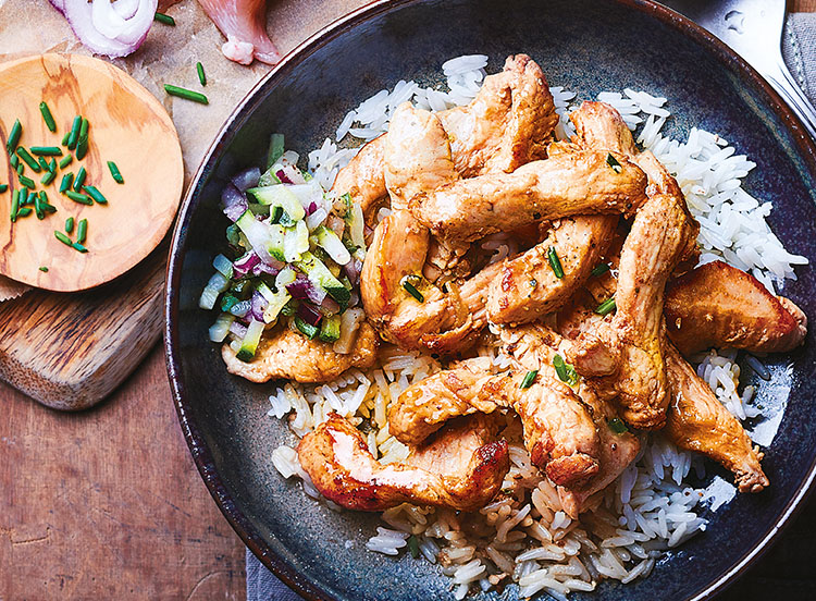 En fin de cuisson, saupoudrez votre viande d'une cuillère à café de curry en poudre, ajoutez 15 g d'échalotes, 2 g d'ail, 2 joues de mangue taillées en dés et 2 dl de crème fraiche. Assaisonnez. Accompagnez de riz basmati aux petits légumes.