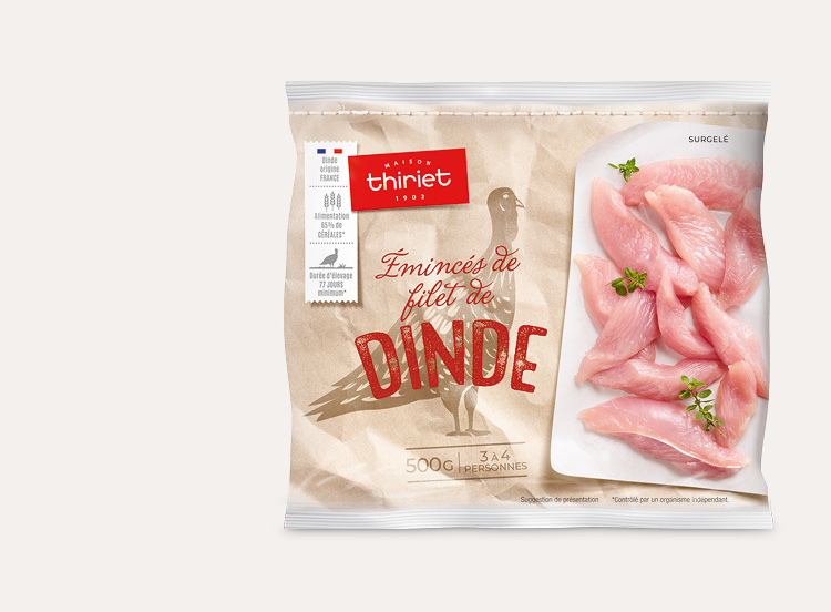 Chez Thiriet nous avons fait le choix de dindes élevées en France avec les caractéristiques d'élevage suivantes : alimentées avec 100% de végétaux, minéraux et vitamines dont 65% de céréales et d'une durée d'élevage de 77 jours minimum pour les femelles et 108 jours minimum pour les mâles.* Chez Thiriet, nous avons fait le choix de dindes élevées en France, alimentées avec 65% de céréales* et dont la durée d'élevage est de 77 jours minimum* pour les femelles et 108 jours minimum* pour les mâles.