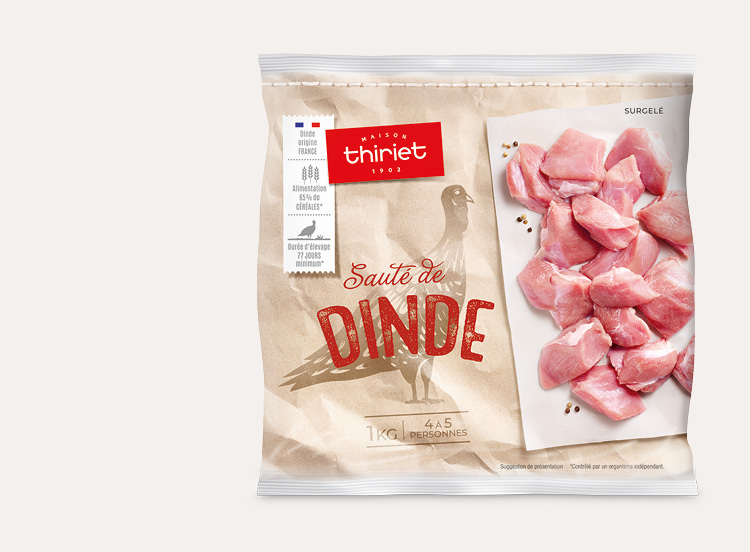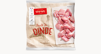Morceaux de dinde (hauts de cuisse et pilons) sans peau et sans os, non assaisonnés, prêts à cuisiner.Du sauté de dinde élaboré à partir de volaille d'origine française. Dans un souci de qualité du produit et de l'environnement, ce sauté de dindonneau est issu d'une filière contrôlée développement durable.* Chez Thiriet, nous avons fait le choix de dindes élevées en France, alimentées avec 65% de céréales* et dont la durée d'élevage est de 77 jours minimum* pour les femelles et 108 jours minimum* pour les mâles.